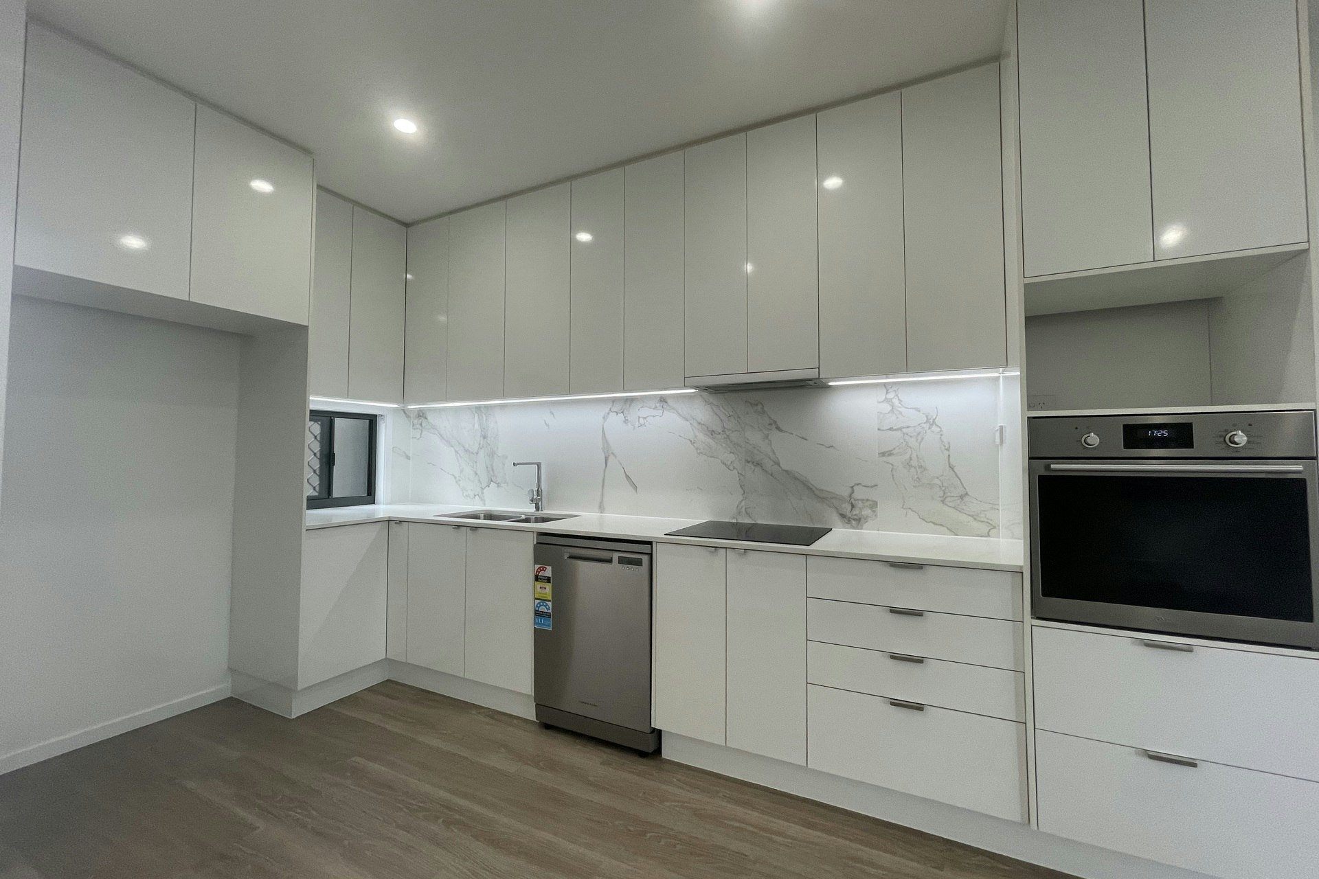 - Modern kitchen with stone benchtops, dishwasher and under bench mood lighting